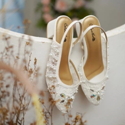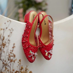 - Sepatu Payet Reffina, sepatu yang memiliki hak tebal ini terbuat dari kain brokat mewah yang dihiasi dengan manik-manik permata serta mutiara yang tersebar apik di bagian depan sepatu